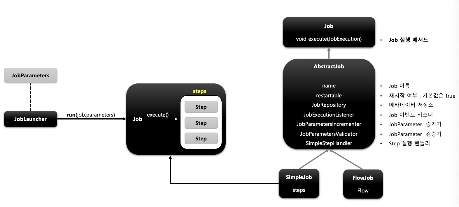 - 배치 Job 을 구성하기 위한 최상위 인터페이스이며 스프링 배치가 기본 구현체를 제공한다